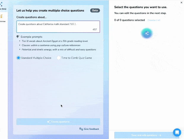 AI Create can quickly create 10 questions about any content; however, you might not always get perfect results. Not to worry! Educators can select the questions they like, and then refine the prompt to generate 10 more questions that better align with what they’re looking for.