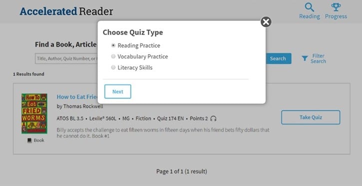 Accelerated Reader (AR) is currently used in thousands of UK schools. It was designed to make the job of managing book reading easier and more reliable, whilst also motivating pupils to read more books for pleasure. Pupils read books of their individual choice and then take AR computer quizzes to check if they have understood what they have read. In the UK, over 45,000 quizzes are currently available, and approximately 2,000 are developed and added each year. There are quizzes on most of the books children are likely to want to read, both fiction and non-fiction, from the most popular books, such as the Harry Potter series, to classics, such as Pride and Prejudice. In addition to the reading practice quizzes, there are vocabulary practice quizzes that test a child’s understanding of particular words and also literacy skills quizzes that analyse 24 different areas of higher-order thinking skills.